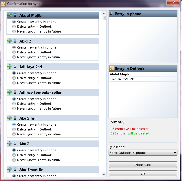 Pada bagian “Sync mode” kamu bisa memilih “Sync both” untuk sinkronisasikan Outlook dan ponsel, “Force Outlook –> phone” untuk memasukkan semua kontak Outlook ke dalam ponsel, atau “Force phone –> Outlook” untuk memasukkan kontak ponsel ke Outlook.